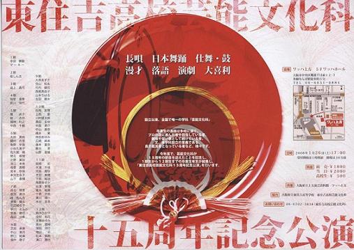 久々にブロガリの方にお会いした。 ポツンポツンと間を空けてお会いしているのに、気軽に話せるのは皆様の懐の大きさだろうと感謝の心を持ちながら、楽しいひと時を貰った。 くらぎょさん、へこみさん、けいさん、ありがとうございました。 3人と別れ、オフ会に行けなくなった理由でもある次のイベントへ。 大阪府立東住吉高校芸能文化科 15周年記念公演 先生が何枚か買ったそうなのだが、行く事が出来なくなったと言うので貰ってきたそうだ。 これを貰うまで、実はこんな学科の在る高校があったとは知らなかった。 まぁ、まだ15年だし、新しい学科なのだと思う。 しかしながら、その中からプロへと移行していった人も何人かいて、1期生からのOBによる公演だと言うことだ。 素人演芸会のようなものだが、落語はプロに転向した方がやっていたのでかなり見ごたえがあった。 桂米朝の弟子だそうだが、しぐさを見ていると、亡き桂枝雀を思い出させる大げさな振り。 初心者の耳をぐいぐい引っ張るのはさすがだったと思った。 その後夕食へ・・・、がここで私は最大のミスをした(汗) 実はその前の晩、うっかりTVで「The Eae」と言う香港ホラーの三部作を見てしまった(汗) おかげで寝不足であったにもかかわらず、そのことをうっかり忘れていて焼肉屋でアルコールを飲み悪酔い(汗) 気持ちわるいったらありゃしない(汗) ふらふらで帰宅してしまった。 化粧も取らずにダウン・・・・。 寝不足のアルコールはお控えください(苦笑) |