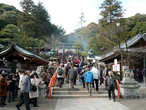 台所の神様というか、「火」の神様なのでここの参拝客は非常に多いです。 でも、「年齢層が高い」参拝客でもあります。 「火」の神様は竈でしょ? 台所を牛耳ると言うのはその家の中を中心となって守る方なわけで、なんでしょうかこれ、いつまでもジジババが家を牛耳っていて若い夫婦には任せていないと言うことか、若い人が竈の神様を祀っていないかのどちらかって事でしょうね。 義母が元気な頃も、やたら張り切ってここに参拝に出かけて、必要以上の数のお札をたわって来たりして、毎年もめたことがありましたよ(苦笑) 「神様をそんなに貰ってきてどうするの」と言ってましたね~。 「だって、みんなにあげようとか思って」 神様など貰っても困るものです。 お祀りしていらっしゃるならともかく、いや、相手に「貰ってこようか?」と聞きもしないで買って来るというのは困るでしょう。 二重になることもしばしばで、相手さんも困り果ててらっしゃっていたわけで、その事でいつも私が謝っていました。 しかし義母の好意を無碍にも出来ず、「ありがとうございます」と言うしかなかったわけで・・・・。 そしてもう一つ、義母はたわって来るのですが古いお札を納めるという行為をしないことで、こんな(→●)状況になっていました。 ま、そんな思い出もありましたね~。 ここは山の上にあるのですが、参道は整備され沢山のお店や屋台がこの時期並びます。 参拝してから後はゆっくりとお店巡りをするのが楽しみの1つ(笑) しかし、冒頭で書いたように参拝客の年齢が高いので、みなさん神社まで行くのが大変そうで。ゆっくりゆっくりと歩かれるのでそれに合わせていると時間がかかってしょうがない(苦笑) そこで、少々この方々より若い私のような中年層の人間は人の波をかいくぐって追い抜かしながら小走りで登って行くわけです(笑)坂ですがそんな急な坂でもないのでトットと先を急ぎます。そして参拝をすませ後はゆっくりと降りていくのです。 清荒神はこの時期一方通行で、写真の正面は実は降りてはいけない道(苦笑) 本当は向かって右にある階段を更に登って元本堂の前から帰るようになっていますが、足のお悪いお年寄りなどは、ここまで登ってくるだけでも大変な道行きで、更に登って降りなければならないというのは過酷と言えば過酷。 これほどの参拝客が居るのだから、神社側としても出来たらスロープなどを考えて頂きたいなとも思ったりもします。 ああ、そうだ。 神社の傍まで車で来れるので、そこから来る人が多いのかも知れませんね~。 下から登ってくるのは私のように車を持たぬものとか、運転してくれる人が居ない方々かも。 100歳で天寿を全うした祖母がよく言ってましたっけ。 タクシーで駐車場まで行って貰って参拝をし、帰りはゆっくり降りてくるのだと。 「みんなゾロゾロ来よってからにぃ~」と苦々しく呟く60代の男性(苦笑) 「そりゃ、仕方がないだろう」とそれを聞いてコッソリ呟く娘(笑) しかし、荒神信仰の信者の数は並ではありません(苦笑) |