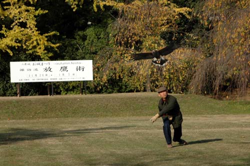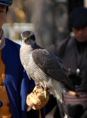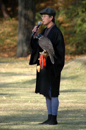 鷹狩りの歴史は古く、お話しによると4000年前に中央アジアの遊牧民によって行われたのが始まりなのだそうです。 日本には1700年前に伝わり、応仁天皇が鷹狩りをしたという記述が残されているそうです。 現在では「NPO法人・日本放鷹協会」としてその技術が残されています。 ちなみにこの方が持っているのは「はやぶさ」(笑) 頭に頭巾を被っているのは外すと直ぐに飛び立ち狩りを始めちゃうからなんですって(笑) 「はやぶさ」と「大鷹」の狩りの仕方が違うんですって。この時目の当たりにして、観覧席の方々がため息混じりの歓声をあげてらっしゃっていました(笑) この写真は「大鷹」 精悍な顔がすてきです。 これら使われている鷹は実は国内の鷹ではありません。国内の鷹は保護鳥ですので捕獲が許されていないのだそうです。 で、これは海外から輸入した鷹。 飛ばしているシーンを頑張って撮るのですが、微妙にピンぼけ(苦笑) やはり私の腕では撮しきれなかったようです(涙) なかなか精悍な顔つきでしょ? これらを扱っている方も受験で受かった鷹匠のお一人。 鷹匠になるのは凄く大変なのだそうで、鷹匠を名乗れる人だけが、上図の装束を身につけることを許されているのだそうです。 その方の、猛禽類取扱店「河童」のHPはここ(笑) ご興味のある方はどうぞ(笑) そうそう、来年のお正月。 1月5日にもう一度ここでこれが見られます。 お暇なら、1月5日、二条城までお越し下さい。 |